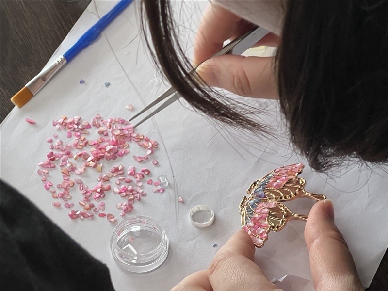 四、定型和調(diào)整:在粘貼螺鈿后,輕輕按壓和調(diào)整它們的位置,確保它們牢固地附著在底托上,并形成滿意的圖案。